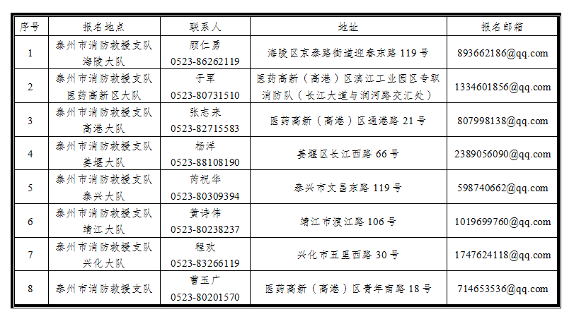 采取網上和實地報名方式。應聘者須填寫《泰州市消防支隊公開招聘政府專職消防員報名登記表》(附件2),同時將本人身份證、戶口本、學歷證書、戶口所在地派出所出具的無違法犯罪記錄證明、所報考崗位所需證書、退役軍人及國家綜合性消防救援隊伍退出消防員相關證明等材料復印件發送至對應報名單位的郵箱(添加時需要備注姓名、報名崗位、年齡、學歷、兵齡、隊齡)。