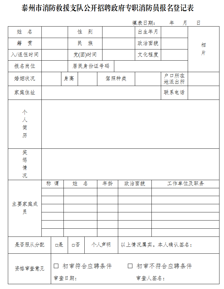 特別提醒:此次招聘工作由泰州市消防救援支隊組織,報名人員如提供虛假資料或故意隱瞞事實,偽造、編造證書、材料等騙取應聘資格的,一經查實,取消聘用資格。